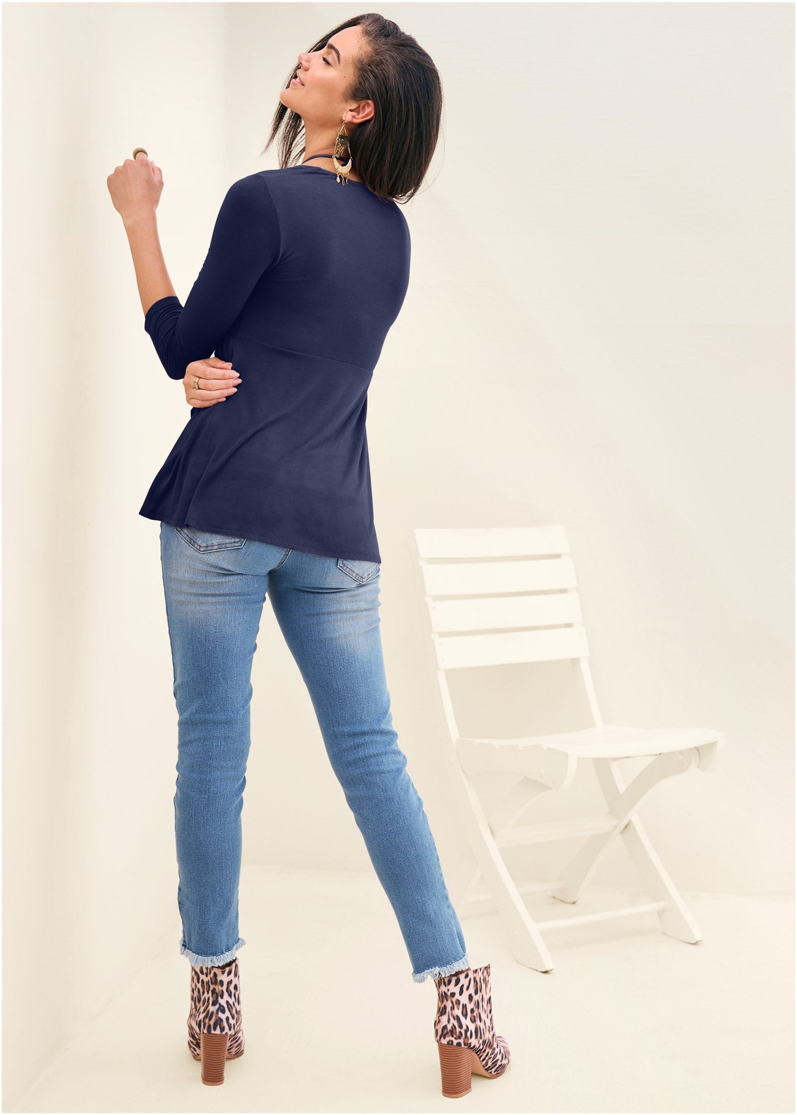 This 3/4-length sleeve top can be worn two chic ways! At the center of the square neckline is an adjustable drawstring that can be tied as a center bow for a more casual look. or tied halter-style behind the neck for a more flirty vibe. Pair this babydoll top with your favorite jeans for an easy-chic everyday look* Sizes: XS (2). S (4-6). M (8-10). L (12-14). XL (16)* Plus sizes: 1X (18-20). 2X (22-24). 3X (26-28)* Square neckline* Adjustable drawstring at neck* Ruching at bust* 3/4 sleeves* Ecovero viscose/spandex. Imported